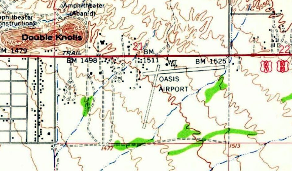 The only topo map depiction which has been located of Oasis Airport was on the 1956 USGS topo map (courtesy of Kevin Walsh).