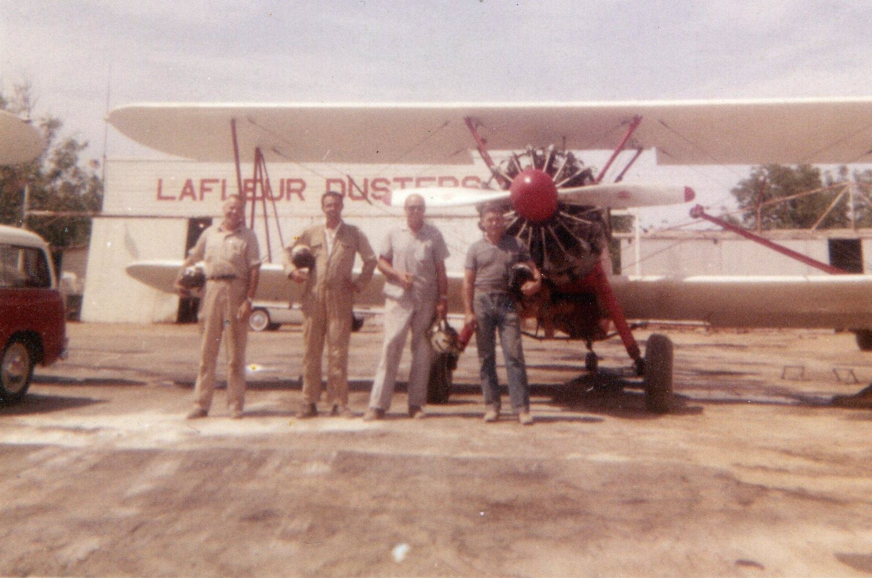 A 1960s photo (courtesy of Ray Winslow) of an unidentified group in front of a biplane & a Lafleur Dusters hangar at Machado Field.