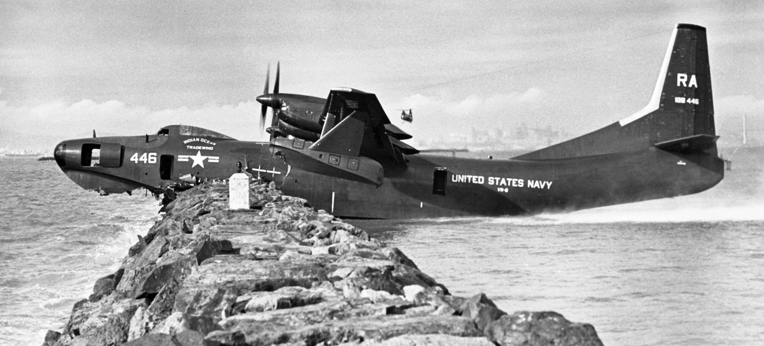 A 2/9/25 photo of Martin JRM-1 Philippine Mars during its stop at Alameda, with the hangars visible in the background.