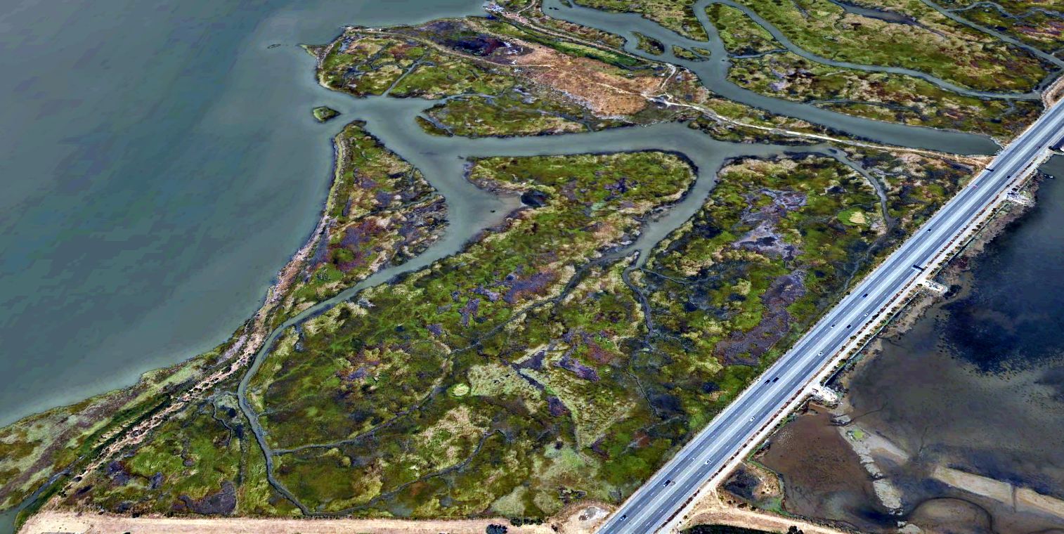 A 4/18/20 aerial view by Kevin Walsh looking north at the former NAS Alameda runways.
