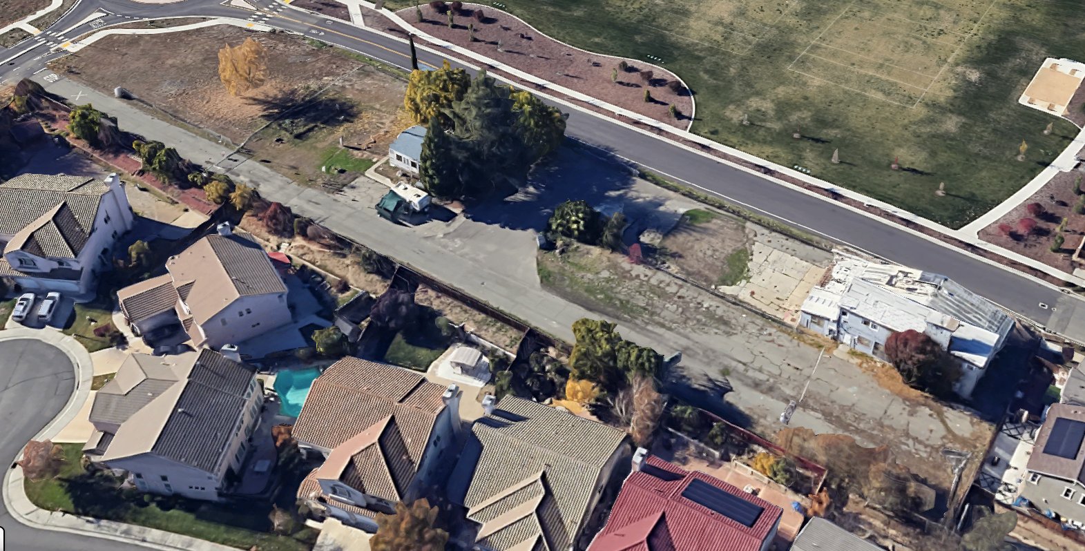 A 2022 photo by Oz Angst looking southeast at the Natomas Airport hangar, “outside a model home window. It is now severely boxed in.