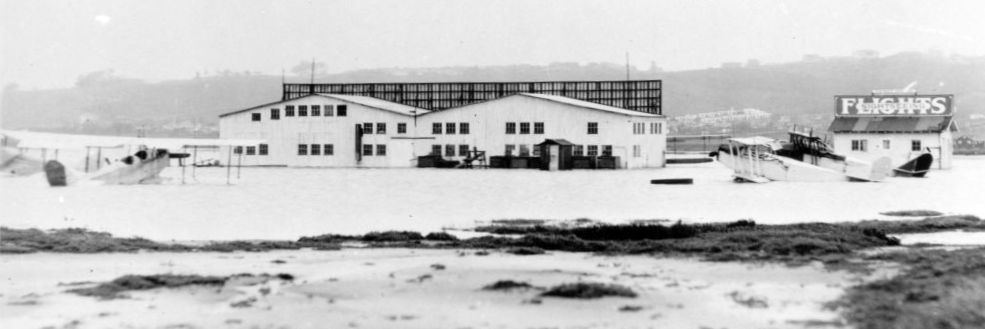 A circa 1920s photo of several biplanes & hangars at a flooded Dutch Flats Airport.