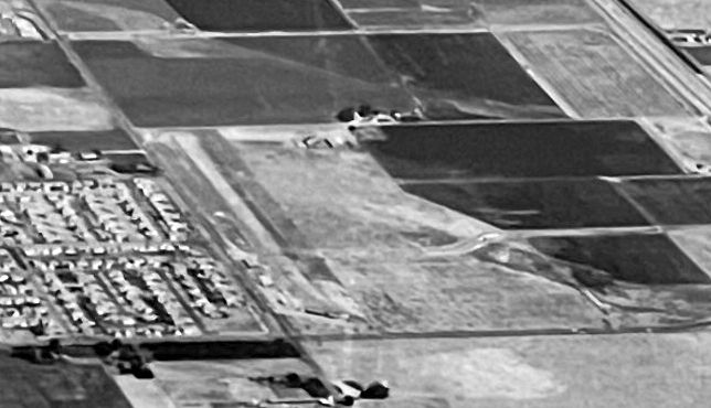 A 1956 aerial photo showed the Ames Airport runway remained distinct, but without any sign of recent aviation use.