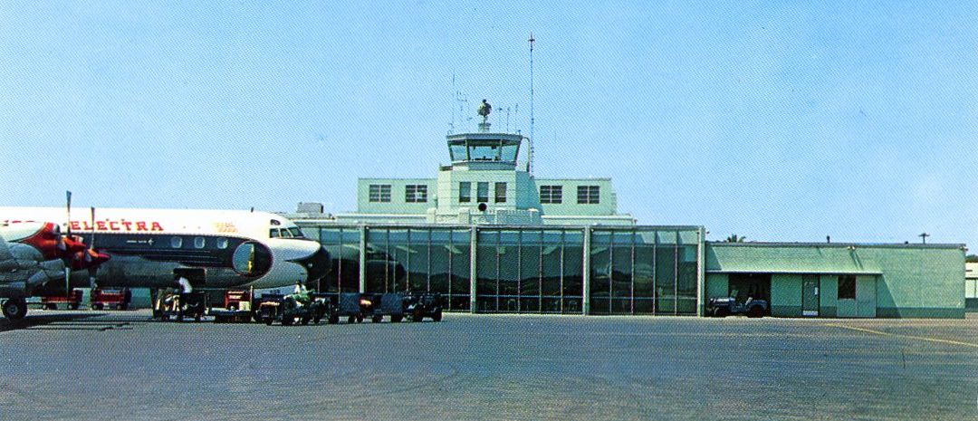 An undated photo from a 1962 postcard (courtesy of Fred Erdman) of a Lockheed L-188 Electra in front of the Imeson Airport control tower.