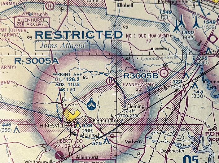 Chris Groshel recalled, “I flew out of Savannah starting in early 1976 & remember seeing some of those old Army fields associated with Fort Stewart at the edge of the Restricted airspace.