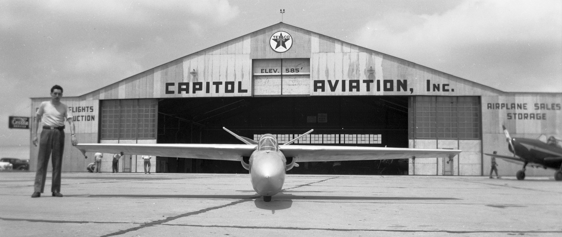 An April 1966 photo by Joe Gurney of 3 aircraft (including a surplus Air Force Republic F-84 Thunderjet fighter) in front of a Parks Air College hangar.