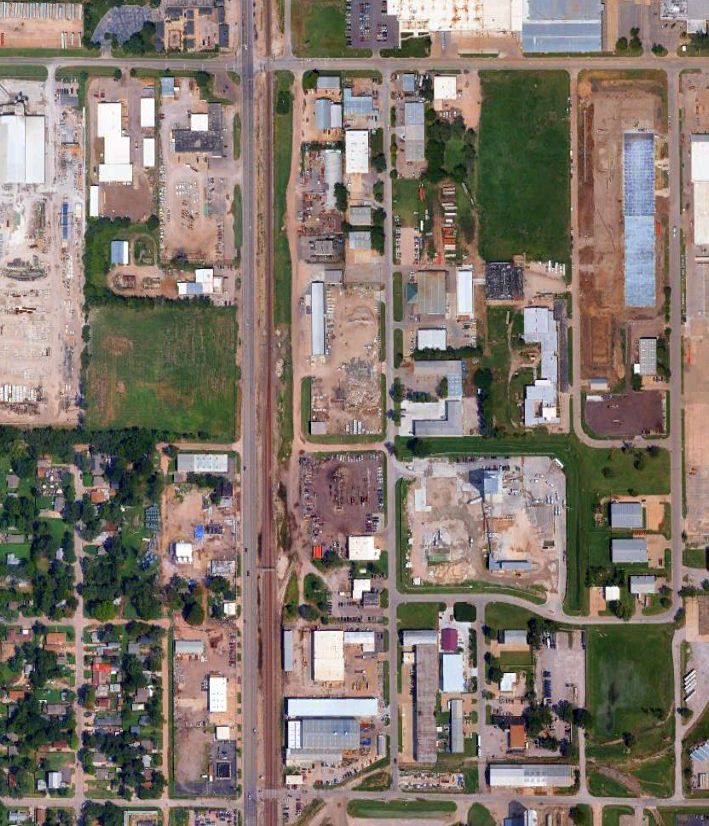 A circa 2006 aerial view looking west at hangars from the former Beech North Airport, now reused as part of the new Raytheon Airport.