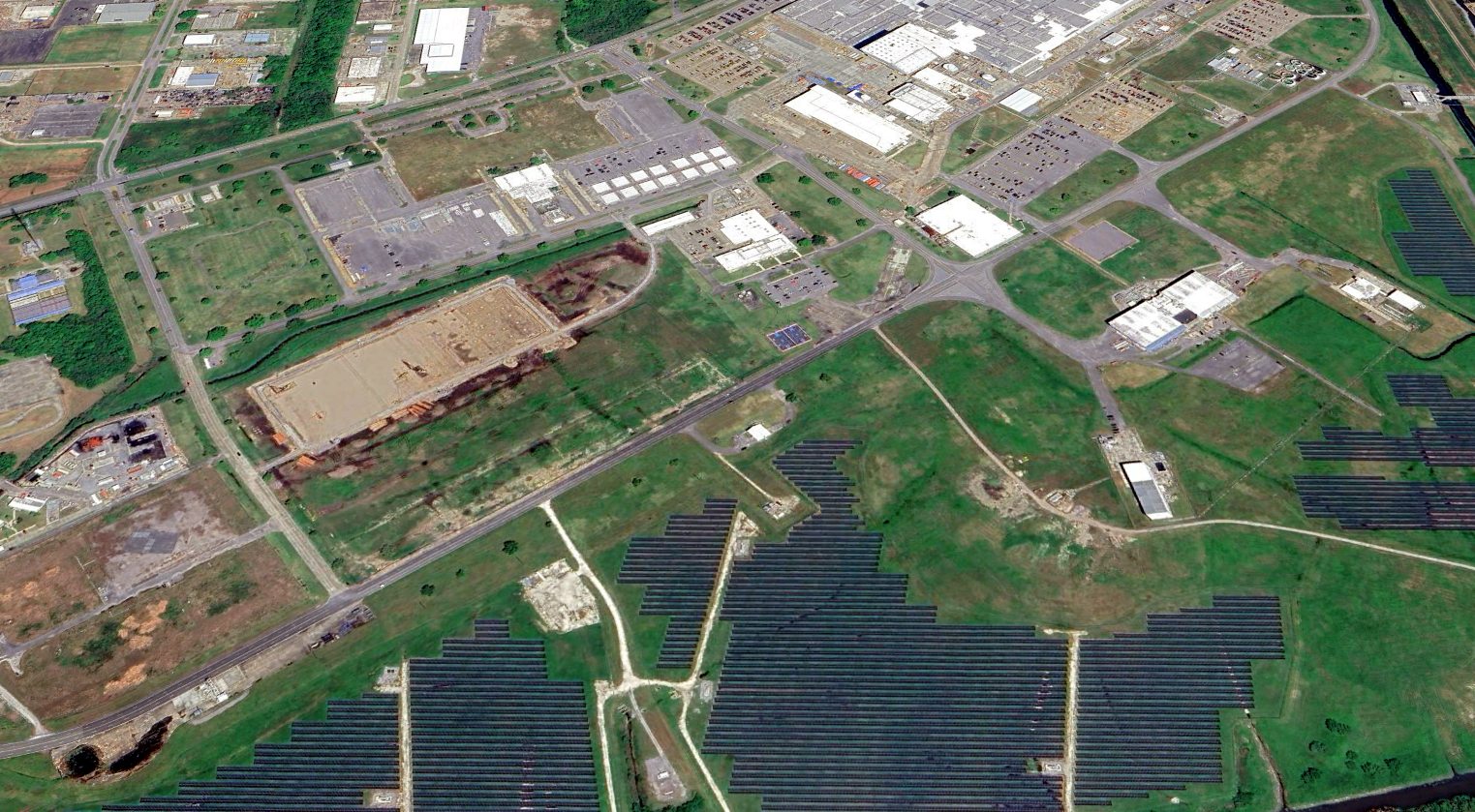 A 2018 aerial view looking east shows the runways & taxiways of the old Alvin Callender NOLF remain intact though deteriorated.