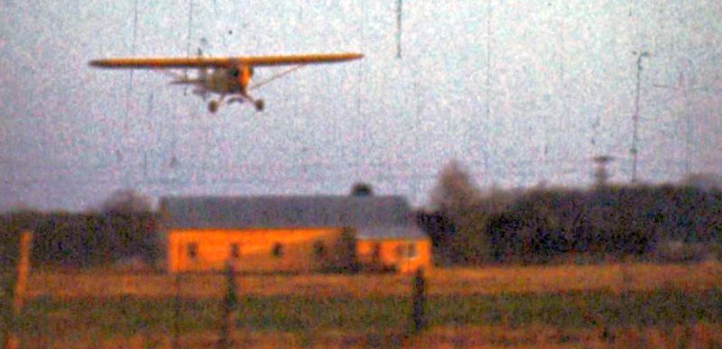 A still from a 1940s movie by Allan Henneberger (courtesy of his son John Henneberger) of a Piper Cub over a hangar, presumed to be at Annapolis Airport.