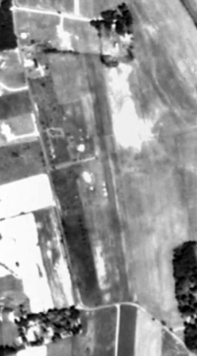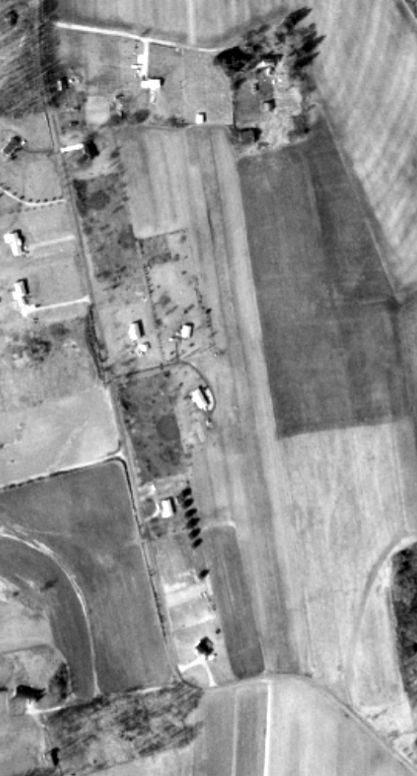 A 1960 aerial photo (courtesy of Susan Kain via Jim Blanchard) looking east/southeast at the Bassler Farm, with Alfred Bassler's 1st plane (a Piper J-4) parked halfway down the "driveway" from what is Cedar Lane to the farmstead.