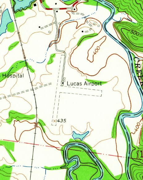 The 1965 USGS topo map depicted Lucas Airport as having 2 unpaved runways, with 4 small buildings on the northeast side.