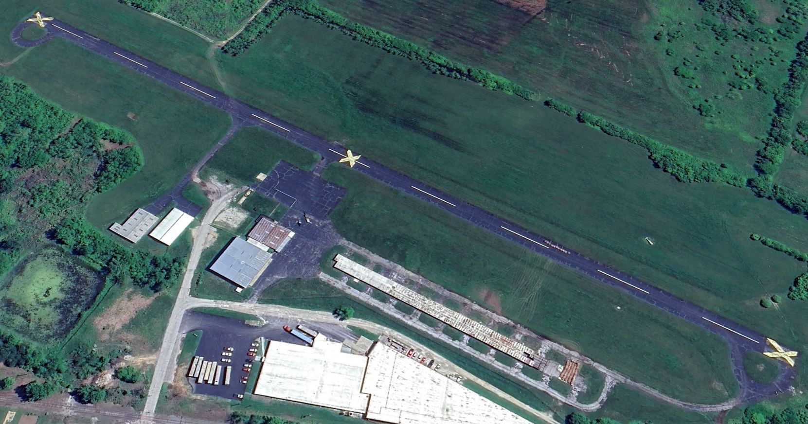 It depicted the airport as having 2 unpaved runways, with a ramp & 2 larger hangars having been added on the southwest side.