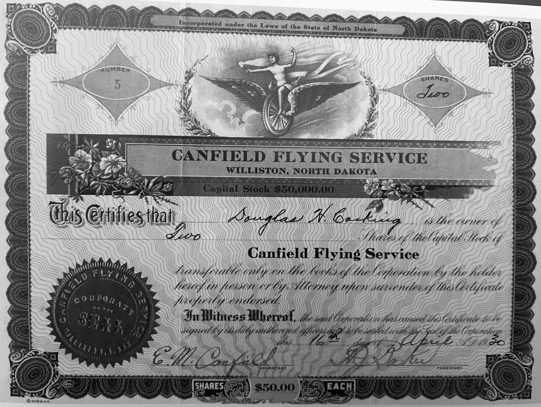 A 4/16/30 certificate for 2 shares of Canfield Flying Service stock (courtesy of Jocelyn Canfield),