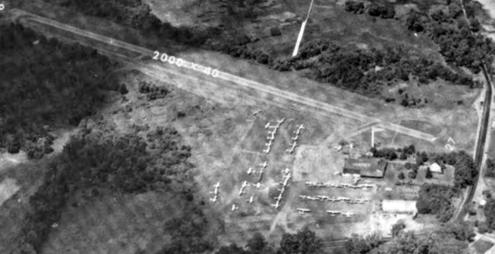 A 2/27/54 aerial view showed the Standard Aircraft factory buildings remained, with the clearing to the northwest (presumably the airfield) also remaining largely clear.