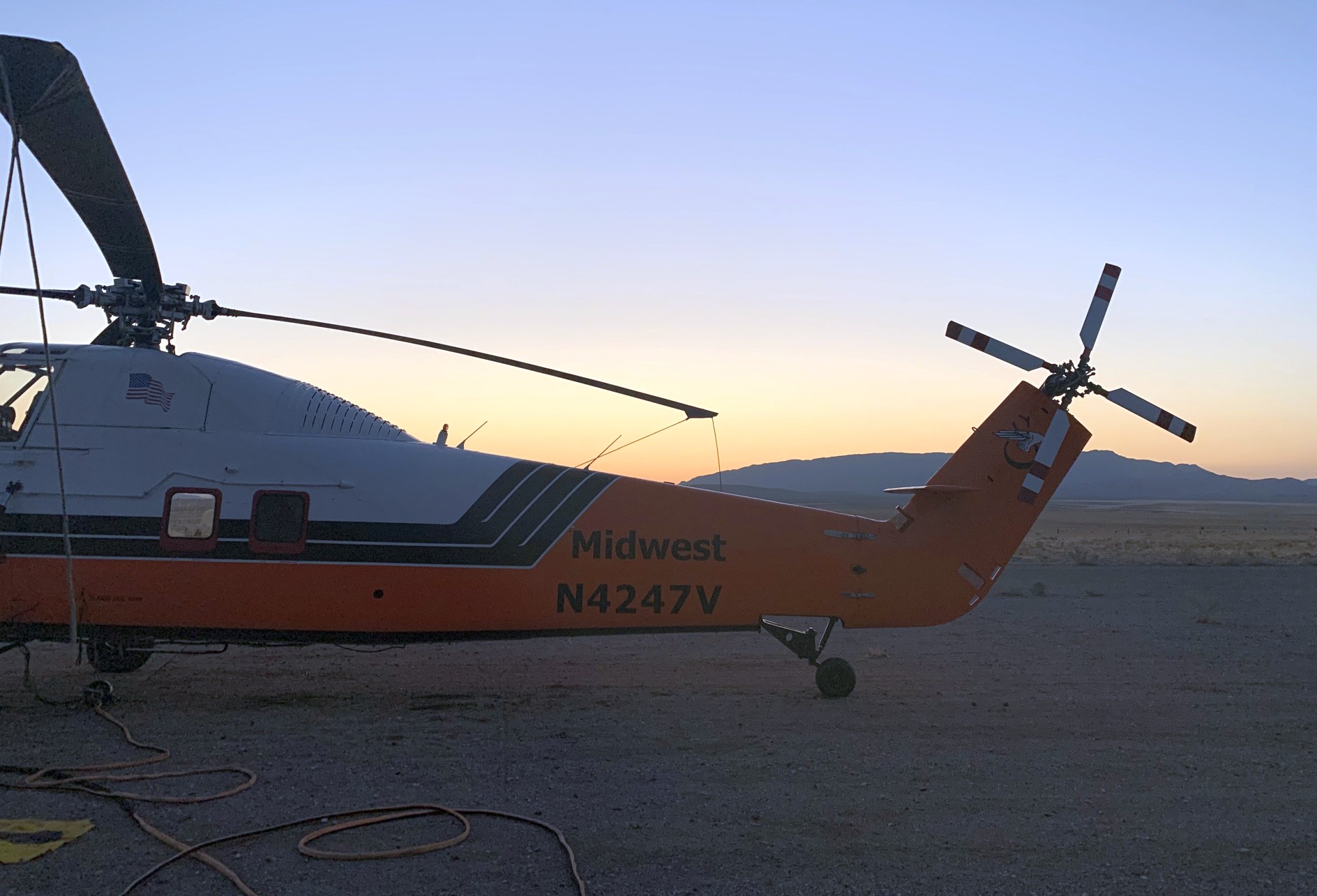 A 2020 photo by Jim Triggs of N4247V, a Midwest Helicopters Sikorsky S-58JT, at Caliente Flight Strip.