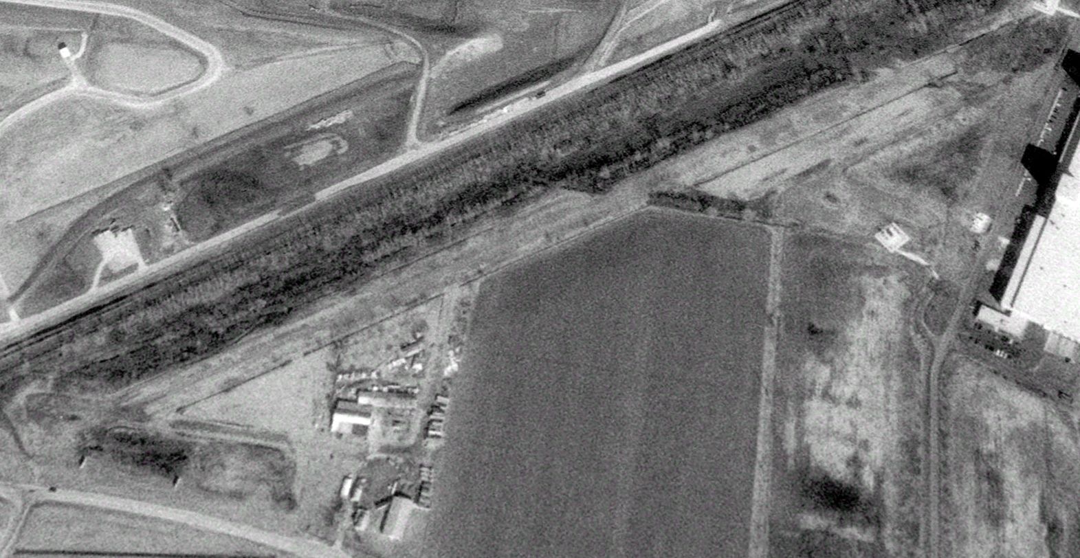 It depicted 2 unpaved runways, generically labeled as “Airfield”, with 3 large buildings to the southeast.