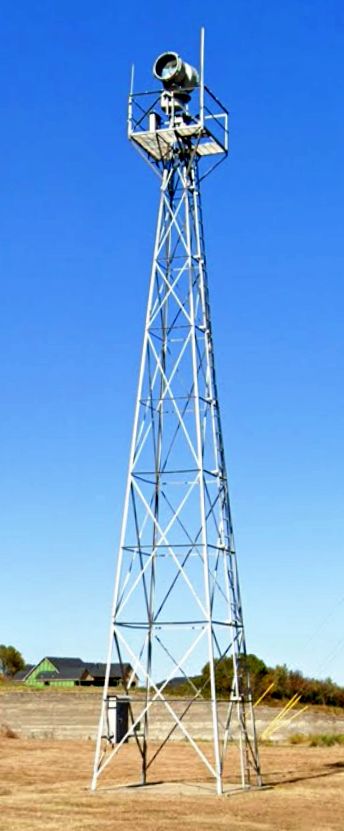 A 2/29/24 photo looking north at Lake Texoma State Park Airport's beacon tower, “located a little way from the airport proper: across State Park Road, next to the park office.”