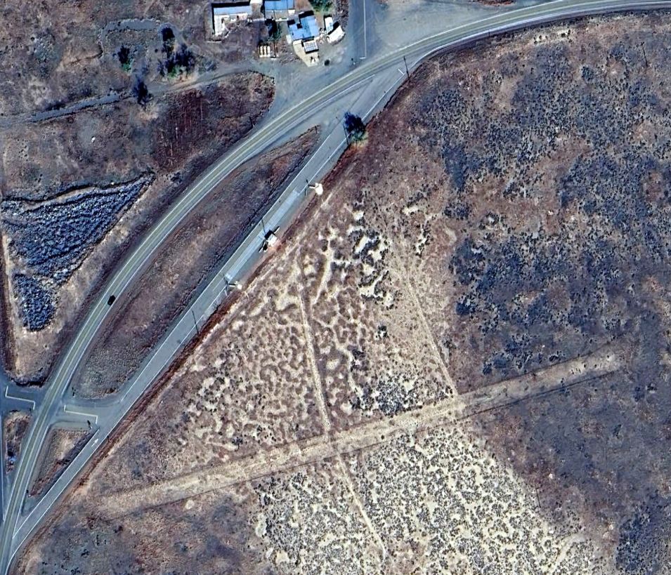 A 2025 photo looking northeast showed the Burns Junction Airfield runway alignment remained barely recognizable.