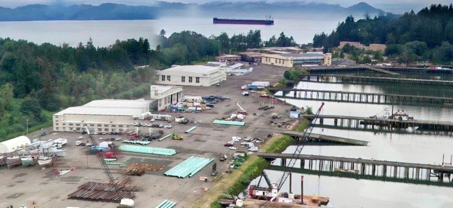 An August 2022 aerial view looking north at the Tongue Point seaplane ramp, 3 hangars, and piers.