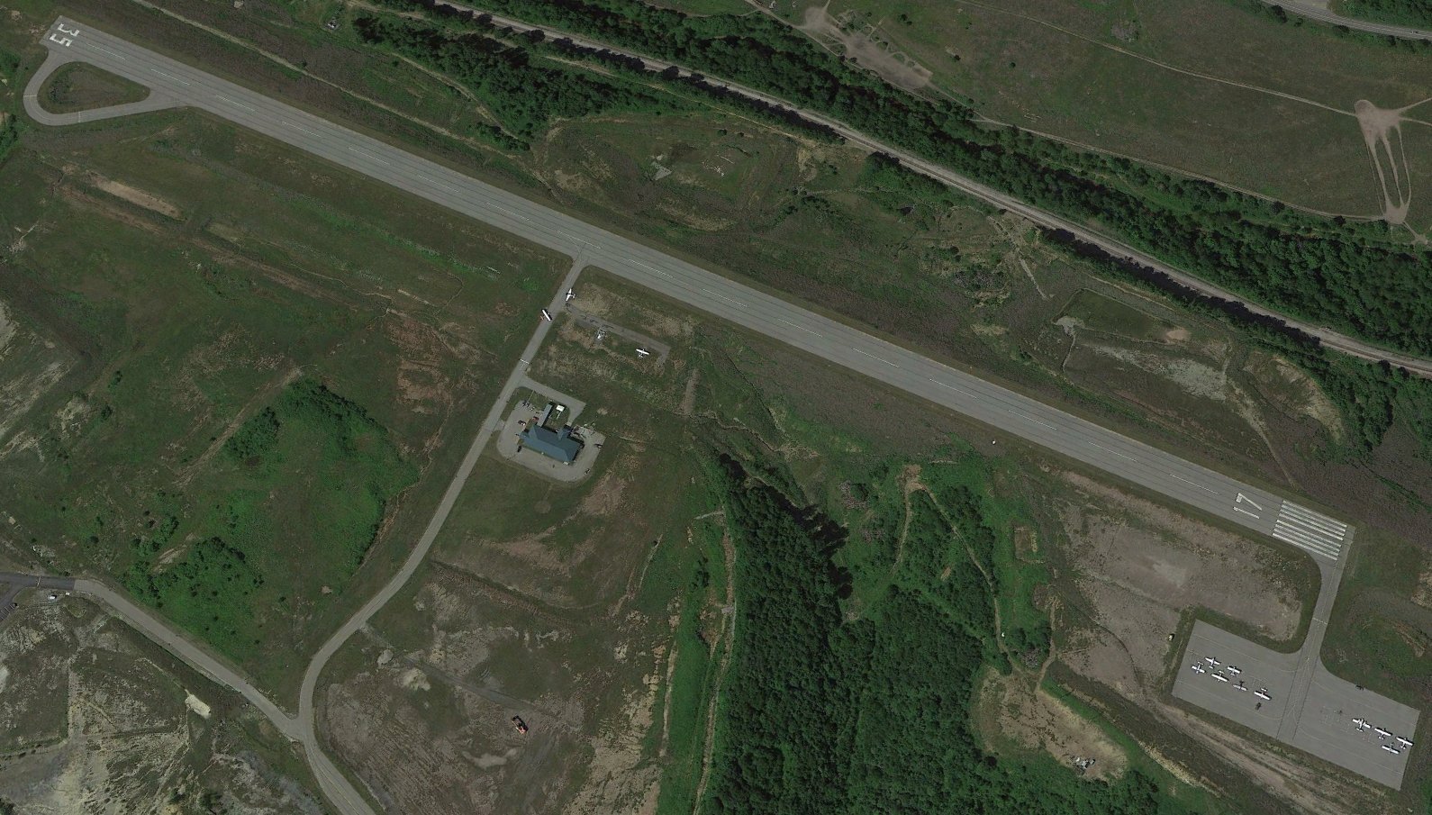 It depicted 2 unpaved runways, with 3 light single-engine planes & a few small buildings on the west side.