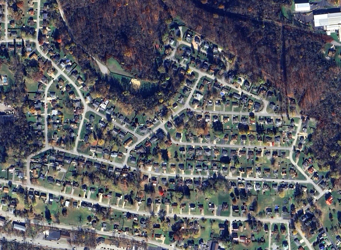 A 2007 aerial view looking southwest showed the Runway “31” markings & “PGH Metro” lettering which remain evident at the site of Pittsburgh Metro Airport.