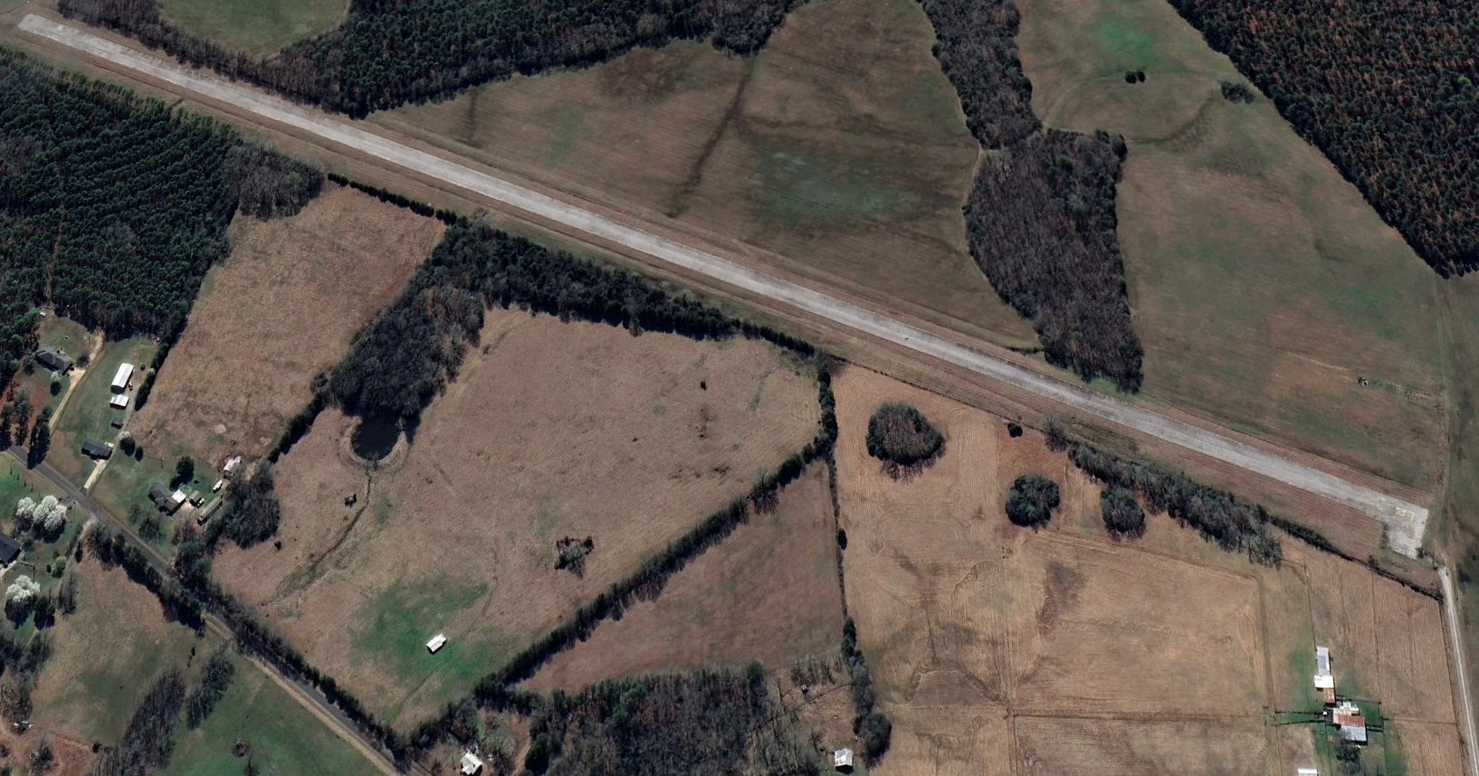 A 2024 aerial view looking south depicted Hester Memorial Airport's runway as remaining intact though considerably deteriorated.