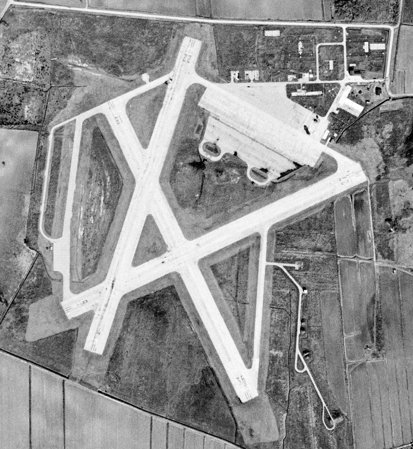 depicted the field as having 3 paved runways, with a large number of aircraft parked on the northeast ramp.