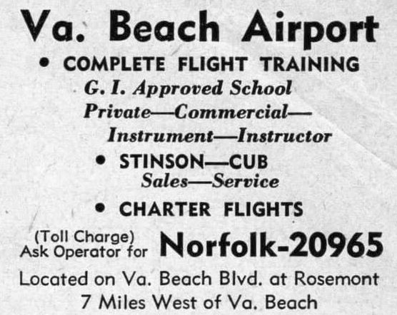A circa 1940s/50s advertisement described Virginia Beach Airport as being on Virginia Beach Boulevard at Rosemont,