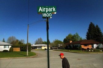 A 2006 photo by Brian Plonka of Jim Nyborg walking in front of the Airpark Drive sign, in the Spokane Valley neighborhood that once was Lemen Airpark.