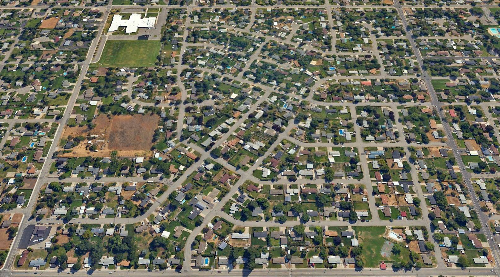 A 2023 aerial view looking south at the Lemen Airpark site showed the diagonal alignment of the former runway is still seen in the street layout, and the former hangar remains on the northeast corner (bottom-left of photo).