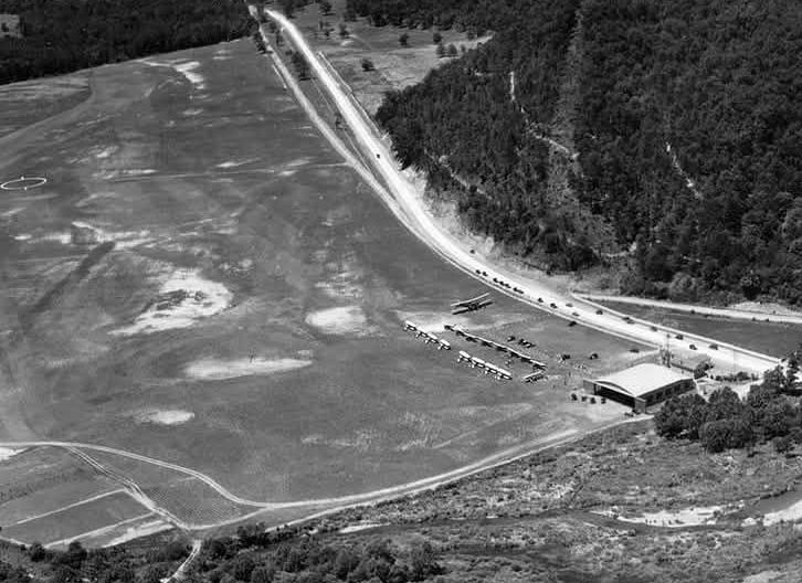A circa 1970s aerial view (courtesy of Rick Harshbarger) looking west at a glider (model undetermined) over Greenbrier Airport, with several light planes parked on the ramp.