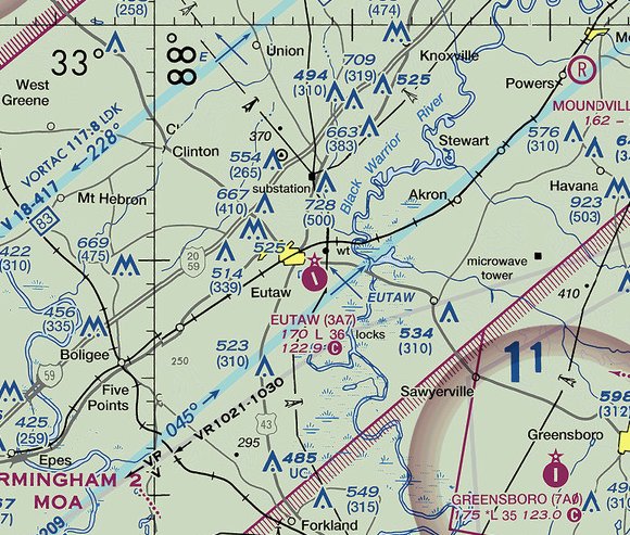 The earliest depiction which has been located of Eutaw Municipal Airport was on the March 1937 Birmingham Sectional Chart.