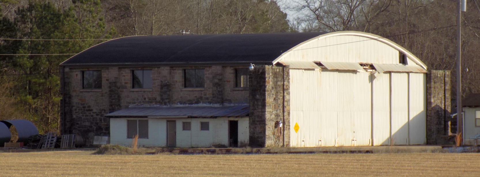 A 1/6/21 photo by Peter Huffman of the 1937 stone-walled hangar at Jasper Airport.