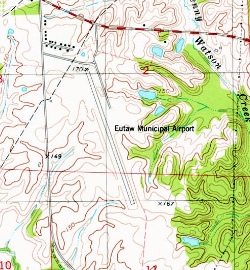 The 1980 USGS topo map depicted Eutaw Municipal Airport as having a paved northwest/southeast runway.