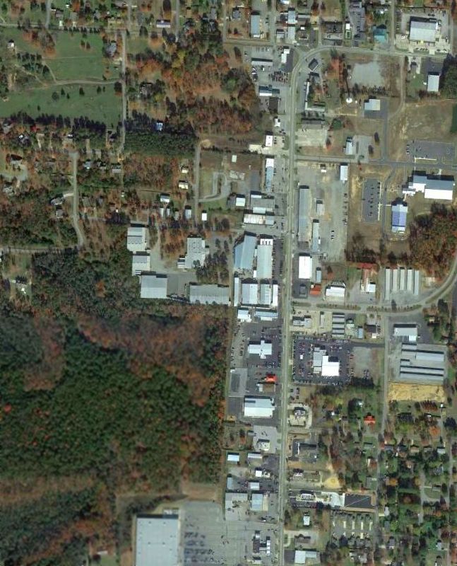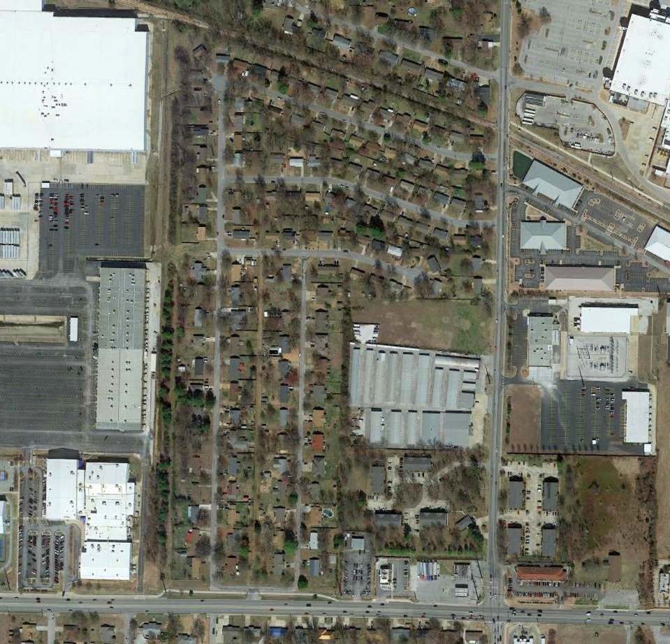 The large warehouse complex bordering the west side of the site is presumably part of the Wal-Mart facilities in Bentonville.