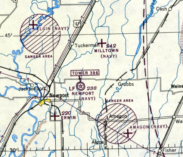 The earliest aeronautical chart depiction of the Erwin airfield which has been located was on the March 1945 Little Rock Sectional Chart.