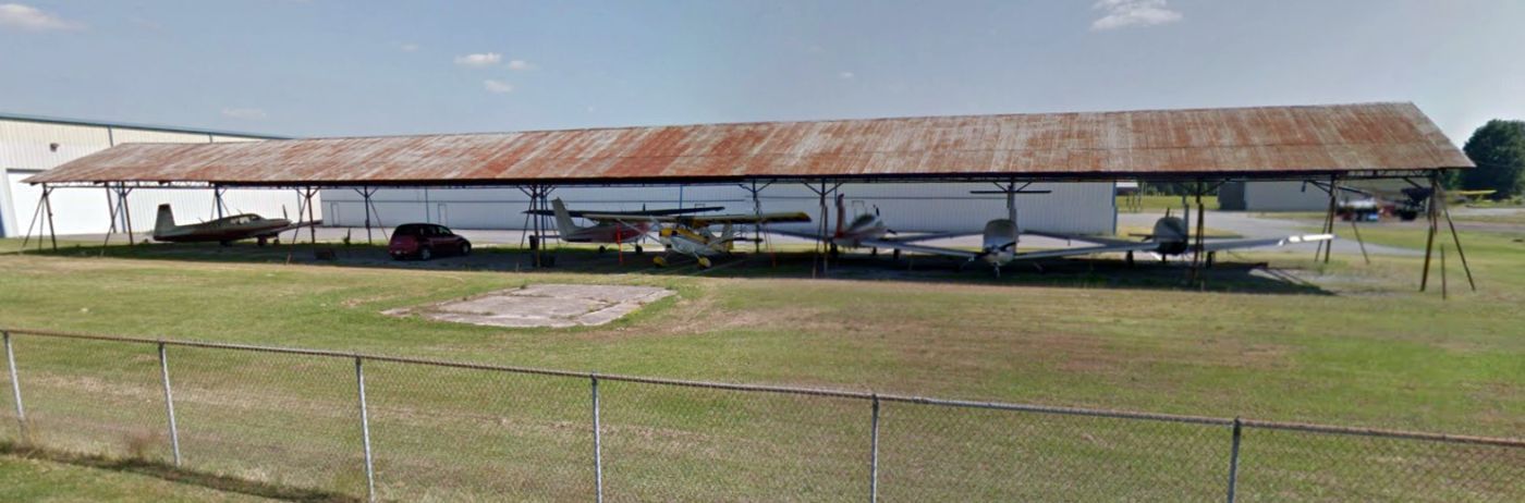 An August 2022 photo looking southwest at the hangars remaining at Wynne Municipal Airport.