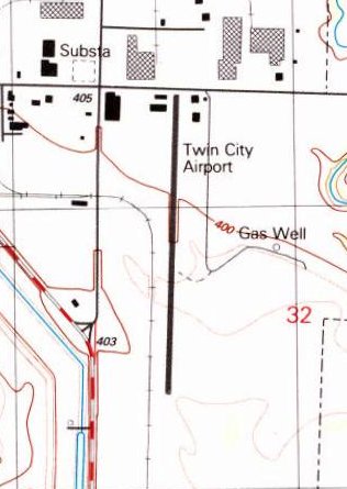 The 1971 USGS topo map depicted Twin City Airport as having a north/south unpaved runway, with 3 small buildings on the north side.