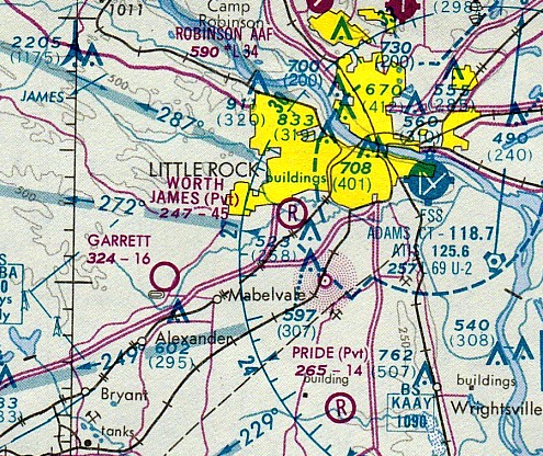 The last aeronautical chart depiction which has been located of Toney Field was on the 1961 Little Rock Sectional Chart.