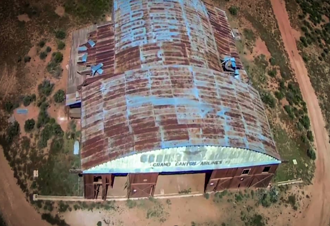 A 2019 aerial view looking southwest at the 80+ year-old hangar which remains standing at Grand Canyon Red Butte Airport.