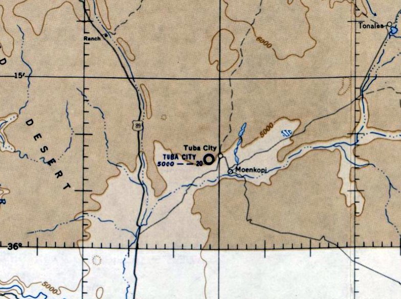 The last aeronautical chart depiction which has been located of the original Tuba City Airport (southwest of the town)