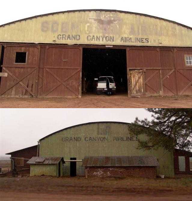A 2018 photo by Michael LaRose of the rear of the 80+ year-old hangar which remains standing at Grand Canyon Red Butte Airport, still bearing the “Grand Canyon Airlines” lettering.