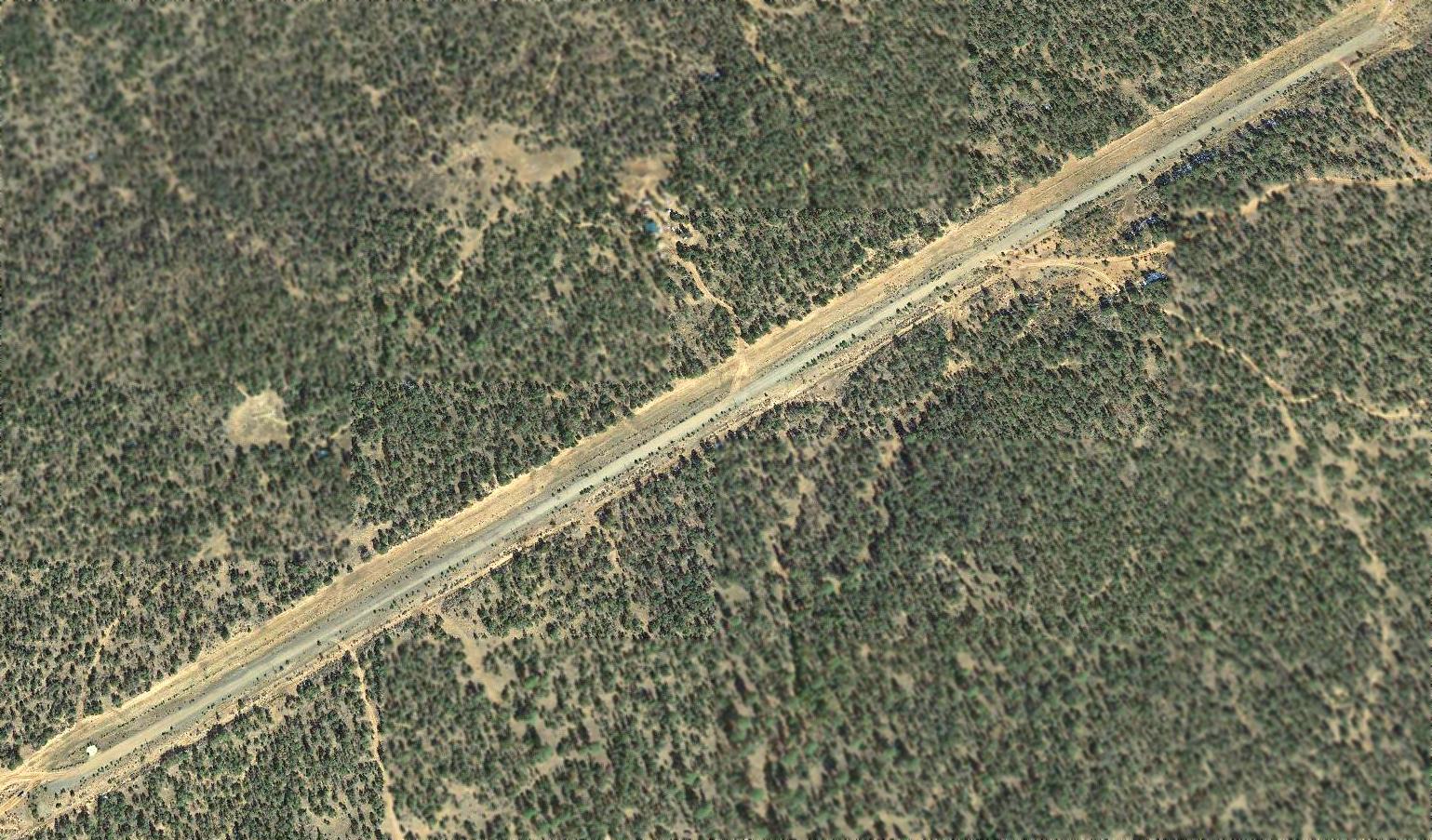 An 8/15/10 aerial view by Dennis Collins (enhanced by Bill Grasha) looking west along the remains of the Snowflake Municipal Airport runway.