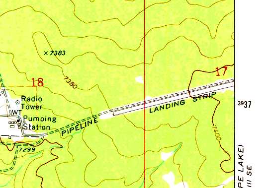It depicted a single northeast/southwest “Landing Strip” parallel to the south side of the pipeline, east of a pumping station.