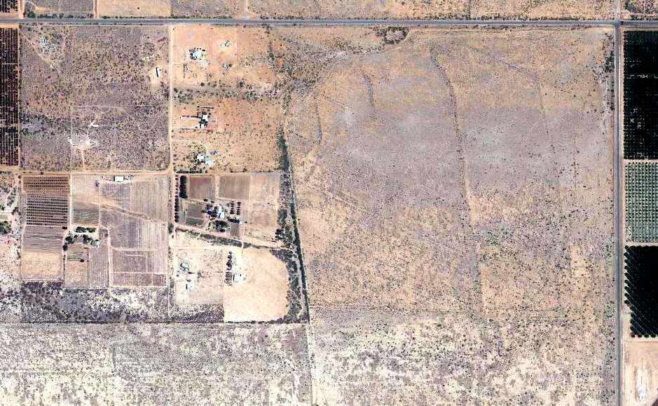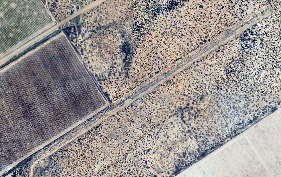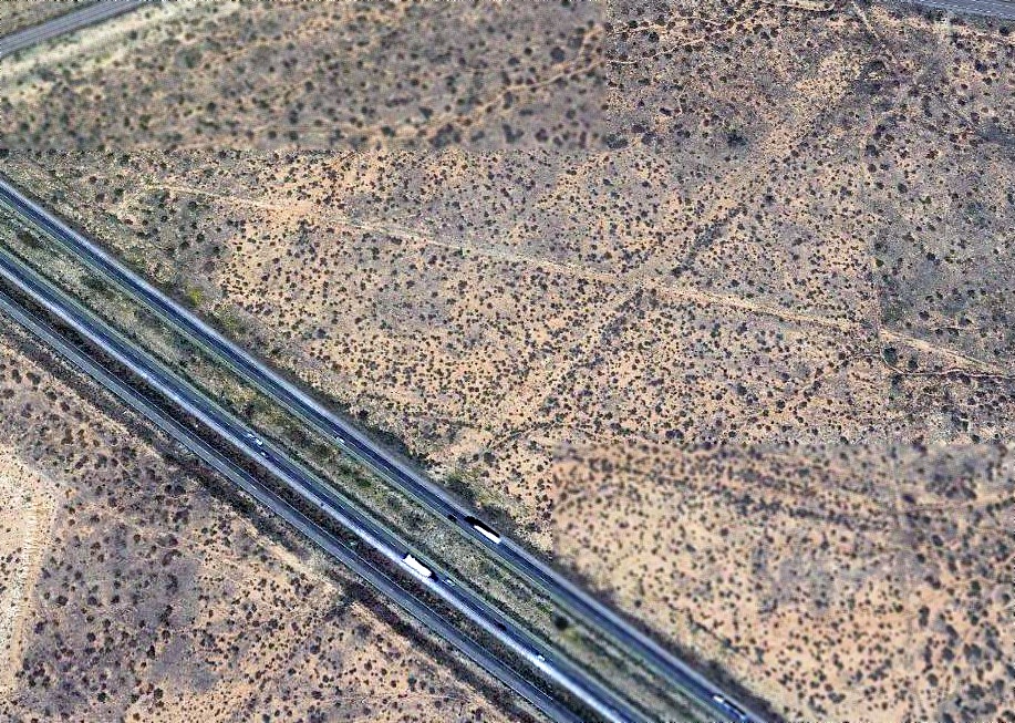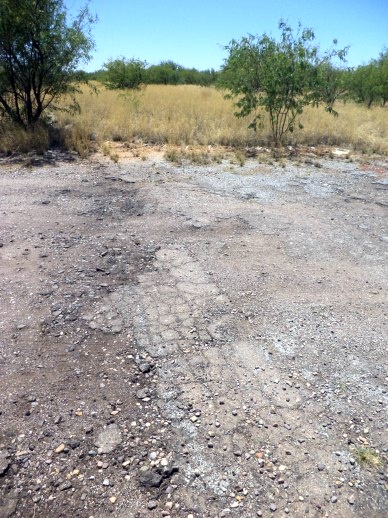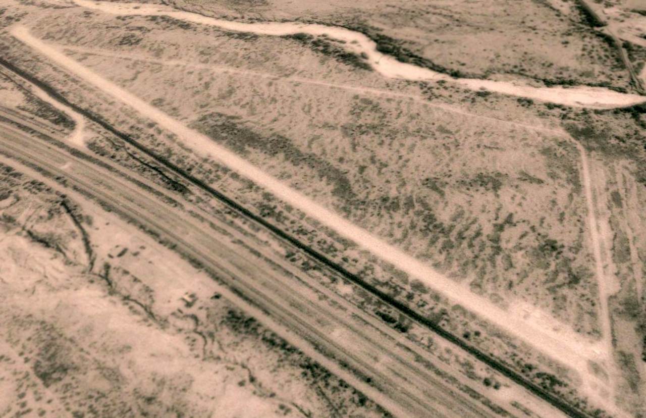 The cracked & exposed runway asphalt, seen on the pic's lower half, lies within another dirt road that heads west.