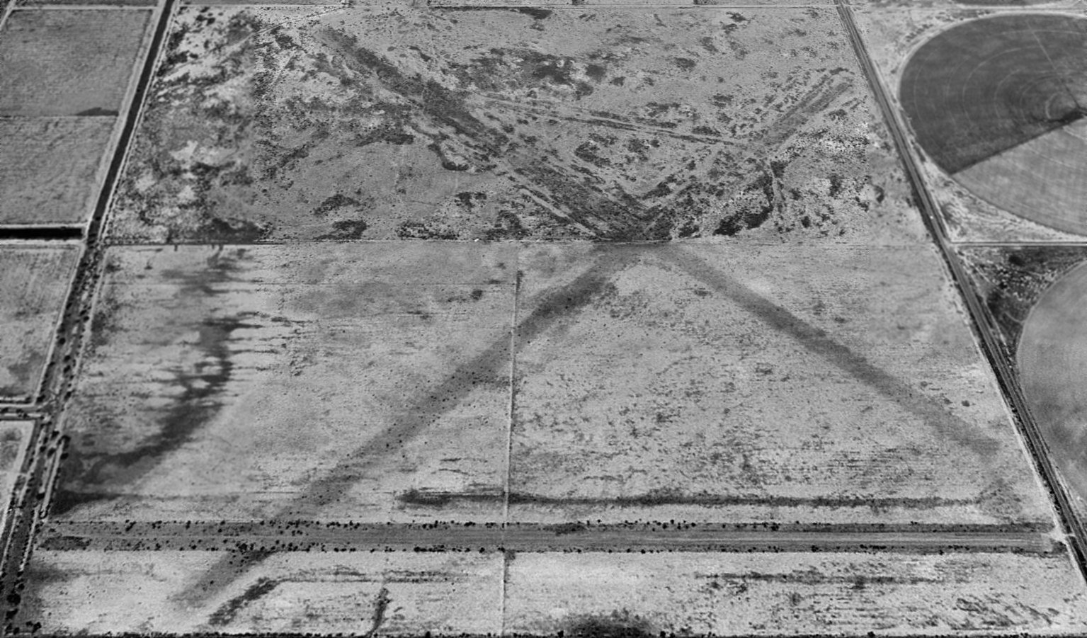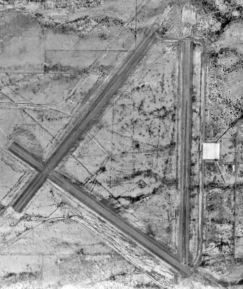 A 1947 aerial view of the site of the original Bowie Airport depicted a cleared dirt square, beyond which extended 2 unpaved runways.
