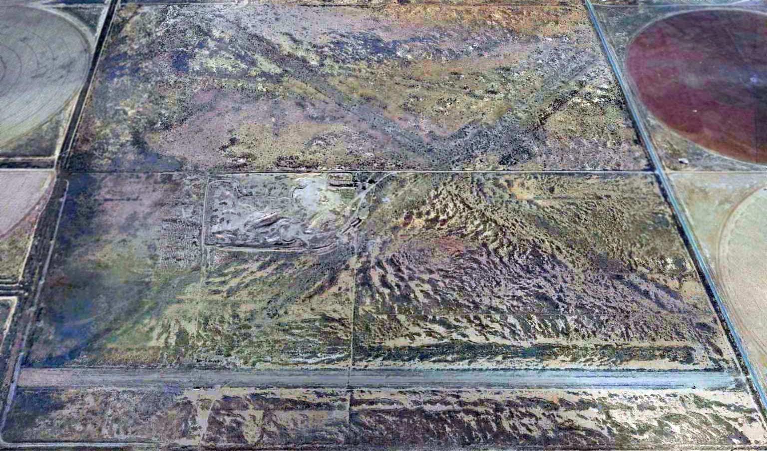 A 2015 aerial view looking northeast showed the remains of the unpaved east/west runway at the site of the 2nd location of Bowie Airport.