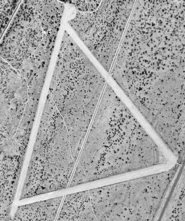 The north/south runway has been graded & reused as 'Airstrip Road'.