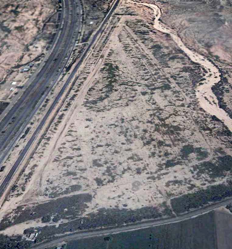 A 2015 aerial view looking north showed the ghosted alignment of the 2 runways at the site of the original Bowie Airport, with Interstate 10 cutting across the southwestern portion.