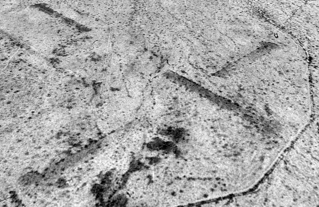 The outline of the 2 runways were plainly apparent. There did not appear to be any remains of any structures.